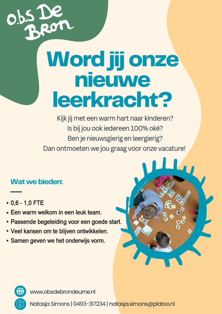 O.b.s. De Bron is een kleinschalige school in de wijk de Koolhof in Deurne. Een school waarin we ervan uitgaan dat elk kind 100% oké is en zeer welkom is, ongeacht afkomst, religie, taal of beperkingen. Op onze school krijgen leerlingen, in samenwerking met andere leerlingen, leraren en ouders, de mogelijkheid om hun kwaliteiten en talenten te ontdekken.